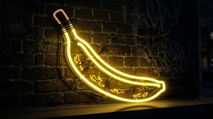 Glowing neon sign against a dark brick wall, with bright tubular light, subtle color spill on surrounding surfaces, and a warm nighttime atmosphere